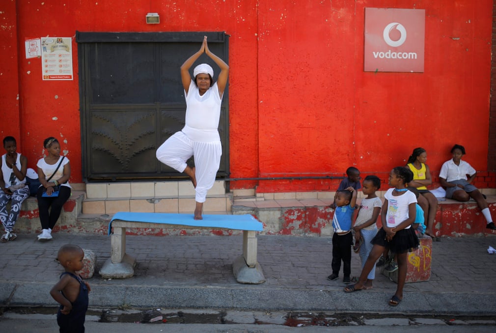 Township resident and yoga teacher Sindiso Moyo demonstrates the plough pose. Moyo, who was born in Zimbabwe, is one of the five teachers being taught by Yoga4Alex.
