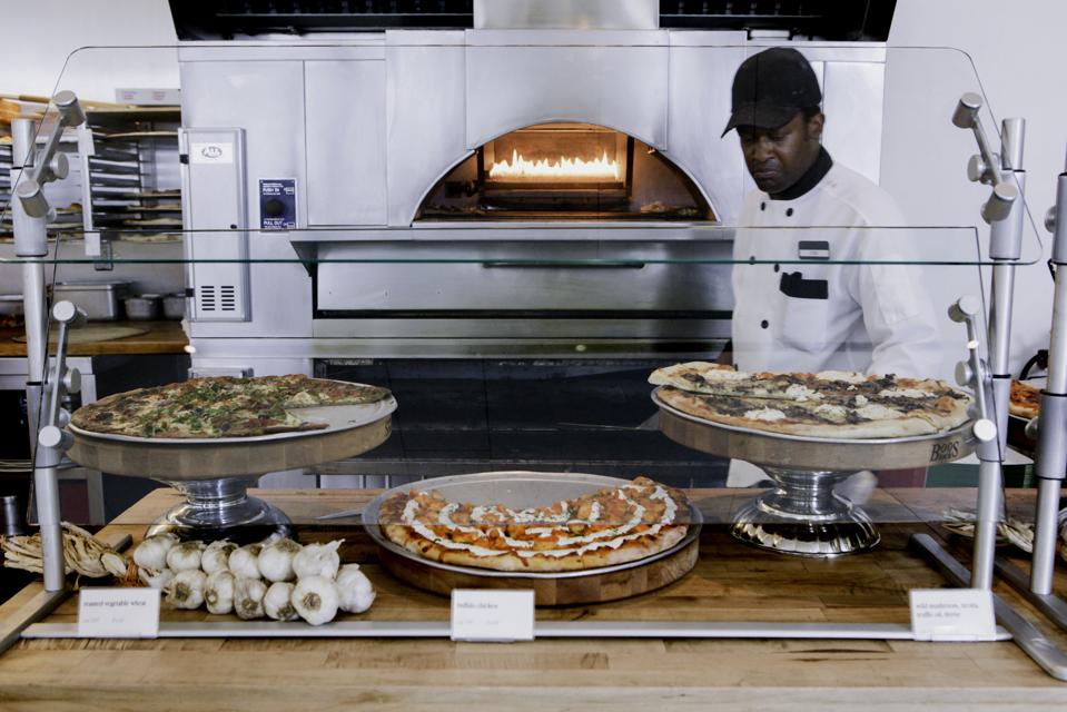 An employee prepares to serve pizza during lunch in the cafeteria of the Goldman Sachs Group Inc. office in New York, U.S., on Thursday, Sept. 10, 2015. Photographer: Chris Goodney/Bloomberg